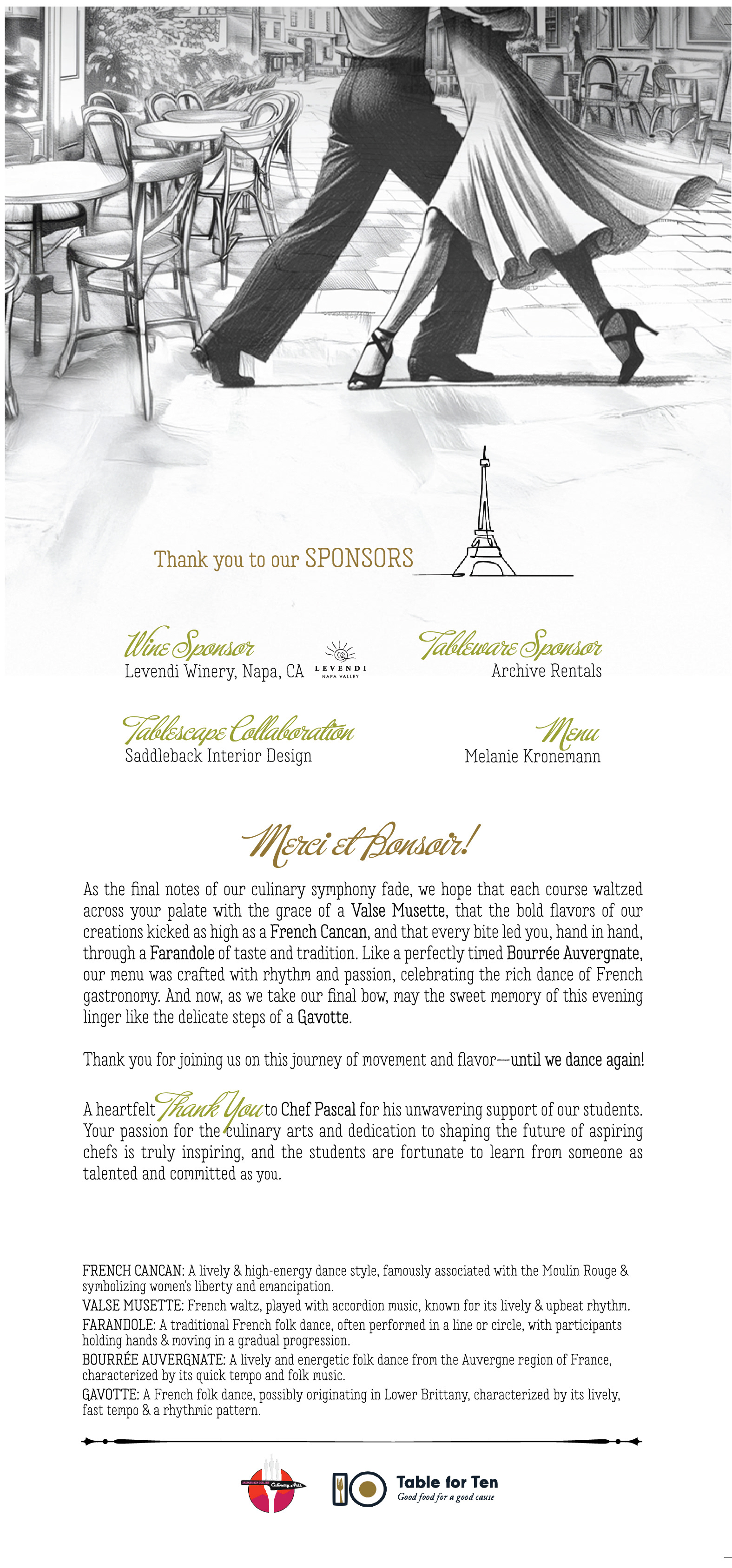 The menu concept was shaped during a live student practice service, where the pacing, movement, and sensory experience of the meal became the foundation for the design. A guest described the experience as “like a dance,” which inspired the central idea: translating movement into menu structure. French dance styles were used to title each course, creating a narrative connection between rhythm, cuisine, and progression.